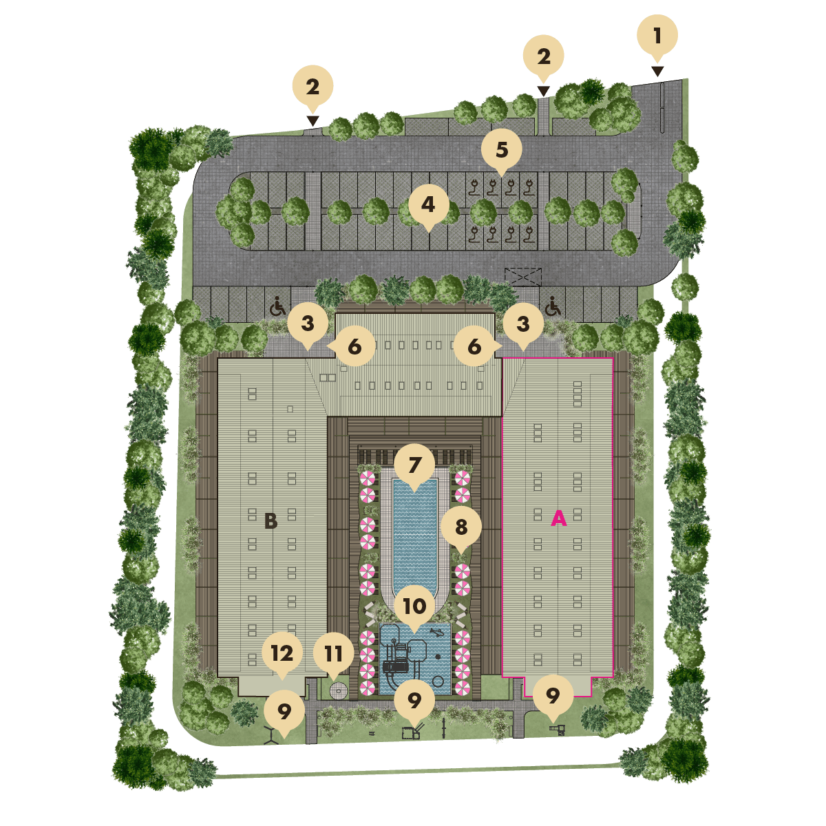 Bogata infrastruktura rekreacyjna to m.in. basen zewnętrzny, mini park wodny dla dzieci i plac zabaw.